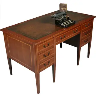 Engels schrijfbureau in mahonie met hulshouten biezen, het schrijfblad ingelegd met donkerbruin goud gestempeld leer dat door de tijd nog mooier is geworden. Voorzien laden, de middelste groot genoeg om een laptop in op te bergen.