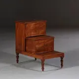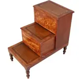 Notenhouten bibliotheektrapje met leer en ebbenhouten inlegwerk, op vier gedraaide pootjes en met twee compartimenten. De bovenste tree kan direct opgeklapt worden, de tweede moet eerst een stukje worden uitgeschoven alvorens dit deksel zich laat opklappen.