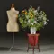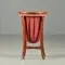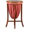 Rond bijzettafeltje met afneembaar bovenblad waaronder een stoffen geplooide knottenzak. Vier elegant gebogen pootjes met een kruisje.