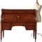 Groot uitgevoerd deftig trommelbureau (ook wel cilinderbureau) in mahonie, rijk voorzien van inlegwerk, een opvallend medaillon midden op de cilinder. Daarin o.a. bladmuziek, een citer, een luid en florale motieven. Ook zeer opvallend zijn de ingelegde biezen van hulst over de poten en zijstijlen. De zijstijlen gaan qua beeld prachtig over in de tapse poten, de ingelegde biezen lijken cannelures. Ook is er zeer veel aandacht aan het bronzen hekwerkje besteed, op alle hoeken volgt dit de vorm van het bovenblad en zo ontstaan er vier kleine cirkelvormen.