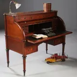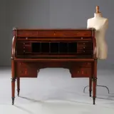 Groot uitgevoerd deftig trommelbureau (ook wel cilinderbureau) in mahonie, rijk voorzien van inlegwerk, een opvallend medaillon midden op de cilinder. Daarin o.a. bladmuziek, een citer, een luid en florale motieven. Ook zeer opvallend zijn de ingelegde biezen van hulst over de poten en zijstijlen. De zijstijlen gaan qua beeld prachtig over in de tapse poten, de ingelegde biezen lijken cannelures. Ook is er zeer veel aandacht aan het bronzen hekwerkje besteed, op alle hoeken volgt dit de vorm van het bovenblad en zo ontstaan er vier kleine cirkelvormen.