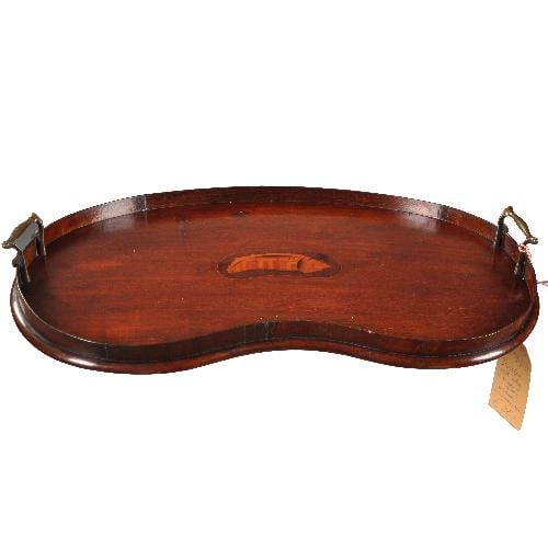 Antieke dienbladen / Engels niervormig mahonie dienblad met inlegwerk en restauraties