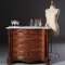 Zijkanten en front zijn royaal gebogen, zuilen op de hoeken zijn vrijstaand in holle nissen, rond de slotentree’s gesneden bladdecoraties. De laden zijn ook van binnen geheel uit mahonie gemaakt. Het marmeren bovenblad volgt de contouren van de kast op de voet en de rand is van een flink profiel voorzien. Het geheel op kleine gedrongen pootjes die net als de zuilen iets naar buiten staan.