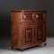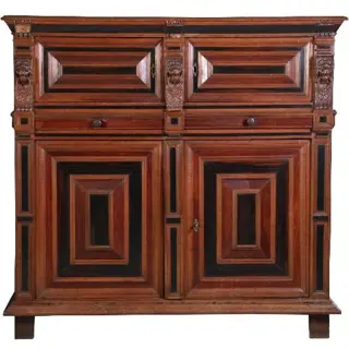 Zeeuwse vierdeurskast in eiken, palissander en ebbenhout, de deurpanelen met palissander kussen met een ebbenhouten vlak en in een ebben kader. De zijpanelen met geometrische patronen ingelegd. Tussen de onder en de bovenkast een brede ondiepe lade.