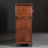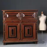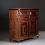 Zeeuwse vierdeurskast in eiken, palissander en ebbenhout, de deurpanelen met palissander kussen met een ebbenhouten vlak en in een ebben kader. De zijpanelen met geometrische patronen ingelegd. Tussen de onder en de bovenkast een brede ondiepe lade.