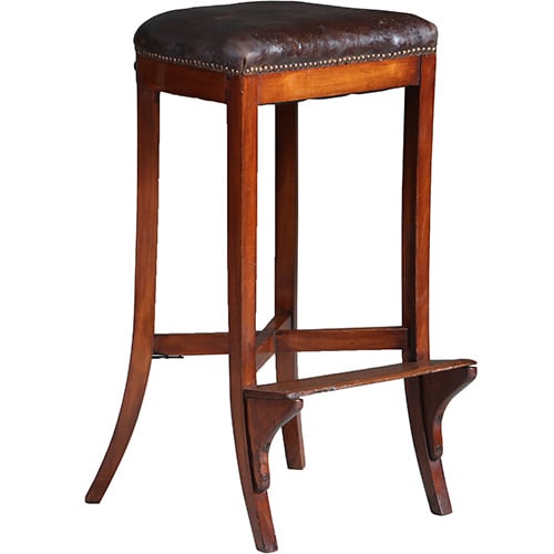 Antieke kruk ca 1810 op 4 sabelpoten met voetenplank het leer prachtig doorleefd