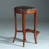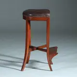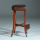 Hollandse mahonie lezenaarskruk met voetenrust, de zitting in donker leer en doorleefd. De poten sabelvormig gebogen van vorm. Onderling verbonden met een kruis. Aan de voorzijde een essenhouten voetenplankje gedragen door consoles.