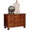 In het orgelgebogen front op het donkere noten vlakken bronzen ladentrekkers en slotentree’s.