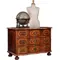In het orgelgebogen front op het donkere noten vlakken bronzen ladentrekkers en slotentree’s.
