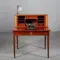 Mahoniehouten schrijftafel op vier tapse poten met twee laden en een opzetkast met verschillende laden en vakjes. Tussen de laden en op de stijlen van de opzetkast en fraai gedetailleerd inlegwerkje. Het vak in het midden is groot genoeg voor onze compacte schrijfmachine, dus ook voor een moderne compacte laptop. De opzet kast staat nu los maar kan d.m.v. 4 schroeven in de aanwezige gaatjes van onderaf worden vastgezet.