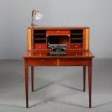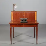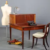 Mahoniehouten schrijftafel op vier tapse poten met twee laden en een opzetkast met verschillende laden en vakjes. Tussen de laden en op de stijlen van de opzetkast en fraai gedetailleerd inlegwerkje. Het vak in het midden is groot genoeg voor onze compacte schrijfmachine, dus ook voor een moderne compacte laptop. De opzet kast staat nu los maar kan d.m.v. 4 schroeven in de aanwezige gaatjes van onderaf worden vastgezet.