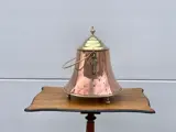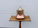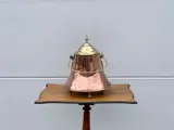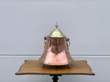 De Rood Koperen Pot staat op drie Messing pootjes en is verder voorzien van een Messing hengsel, Beslag en deksel