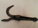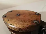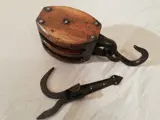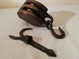 Oude antieke scheepskatrol en boothaak, katrol essenhouten ijzeren haak en tropische pokhouten rollen, één heeft een scheur en beide draaien vrij, gesmede ijzeren boothaak, oude zeelieden gebruiken deze liever dan de moderne alluimium of plastic. Lengte van de katrol 340mm blok 160 X 120 X 120mm Boothaak