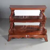 Stel van twee grote wandtafels met drie niveaus met spiegelachterwand. De drie bladen lopen in maat naar boven iets toe. Staand op fraai gesneden en geschulpt onderstel. De geslingerde dragers overhoeks geplaatst.