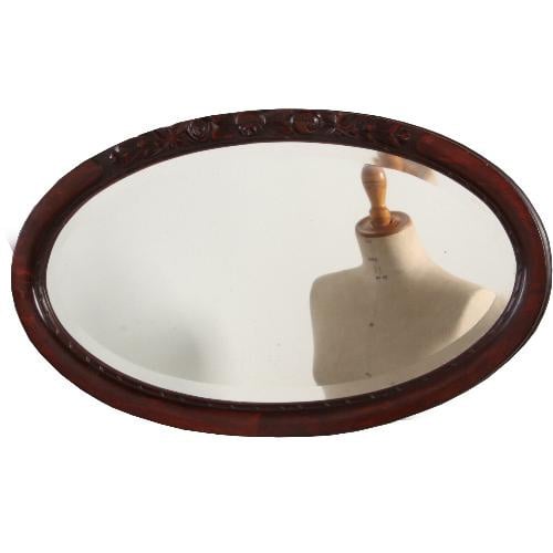 Klein arts and crafts Engelse ovaal in gepolitoerd donker eikenhout met een geslepen facet, aan de bovenzijde (of desgewenst onderkant) een gestileerde rij van kleine gestoken roosjes.