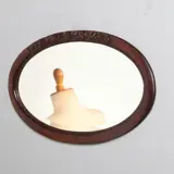 Klein arts and crafts Engelse ovaal in gepolitoerd donker eikenhout met een geslepen facet, aan de bovenzijde (of desgewenst onderkant) een gestileerde rij van kleine gestoken roosjes.
