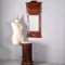 Rechthoekige spiegel in een grote mahonie lijst met een gecontourneerde kroon, in het paneel in de kroon een halfrond verdiept paneel, daarop een bronzen zonsopkost, in het verdiept ovaal paneel aan de onderzijde kruisende speren. Langs het spiegelglas ingelegde fillets van palmhout op de hoeken een messing rozet.