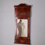 Rechthoekige spiegel in een grote mahonie lijst met een gecontourneerde kroon, in het paneel in de kroon een halfrond verdiept paneel, daarop een bronzen zonsopkost, in het verdiept ovaal paneel aan de onderzijde kruisende speren. Langs het spiegelglas ingelegde fillets van palmhout op de hoeken een messing rozet.