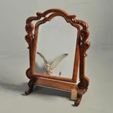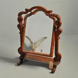 Kantelbare mahoniehouten Victoriaanse kapspiegel. Het rijke steekwerk is levendig gestoken en fraai van verhoudingen. Het onderplankje is gebogen uitgevoerd en daardoor rollen de sierraden of haarspelden er niet af.