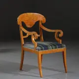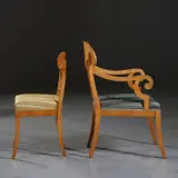 Stel van 6 eetkamerstoelen in prachtig blond berkenhout met berkenwortel in de fraai gebogen kappen van de rugleuningen. Van de zes stoelen zijn er twee met armleuningen uitgevoerd, deze zijn ook ietsje groter dan de 4 eetkamerstoelen zonder armleuningen.
