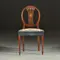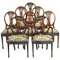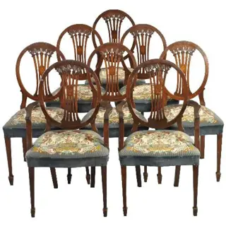 Stel van 8 Engelse Hepplewhite stoelen waarvan 2 met armleuningen. De ovale rugleuningen met een fijn gedetailleerde opengewerkte rugstijl. In het midden daarvan een fraai ingelegde ovaal met daarin een klassieke vaas met oren. De achtepoten uitgebogen de voorpoten taps met een klein taps blokpootje. De zittingen met een geborduurde zitting met een staand boord van blauw velours.