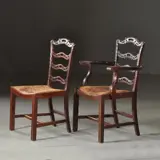 Comfortabel stel stoelen met gebogen zittingen waarvan 2 met armleuningen in uitzonderlijk fraai gepatineerd mahonie...