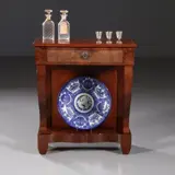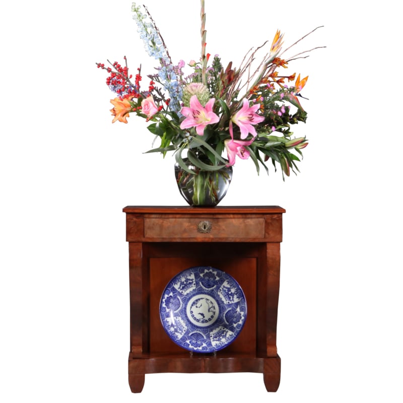 Vrij van beschadigingen, kleine normale gebruikssporen, de lade met een opgelicht bloemmahonie front, compleet met sleuteltje.
