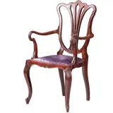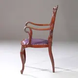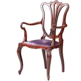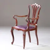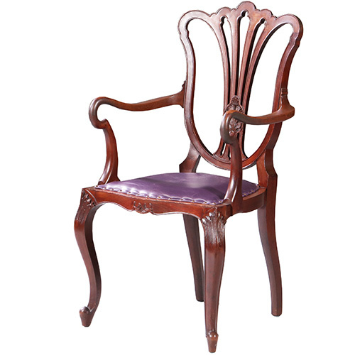~ Meerdere exemplaren beschikbaar (4X) ~ Elegante armstoel, Engeland Hepplewhite stijl in noten met lila rundleer, een opengewerkte rugleuning en zeer fraaie armleuning.