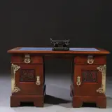 Het bureau heeft markante messing sierbeslag als uitzonderlijk uitvergrote scharnierbladen waarin een soort zeemonsters of fantasiefiguren te herkennen zijn. De deurgrepen en ladentrekkers zijn in verglijkbaar opvallende uitvoeringen gemaakt. Samen met het verdiepte gestoken paneel en de kloeke plint met uitgezaagde poten is dit een zeer sprekende en opvallende blikvanger.
