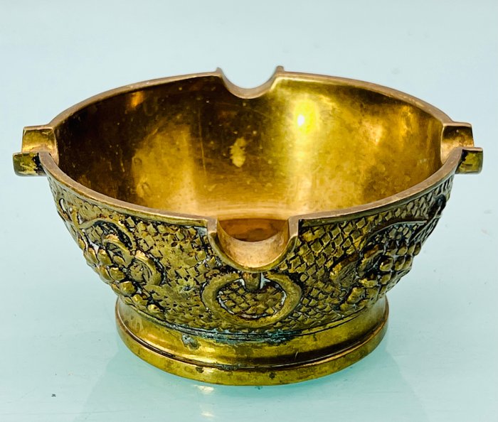 Oude asbak met symbolische reliëfs van de god Bacchus met druiventrossen en wijnranken. Het is een bronzen asbak die in goede staat is bewaard, zoals te zien is op de foto's.