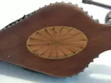 Oude Napolitaanse balg in hout ingelegd met fruithout, lederen inzetstuk (open aan een kant zoals op de foto te zien) bronzen noppen en punt.
