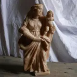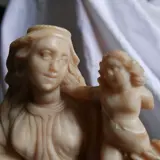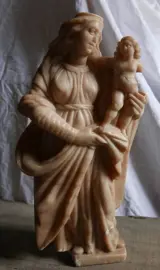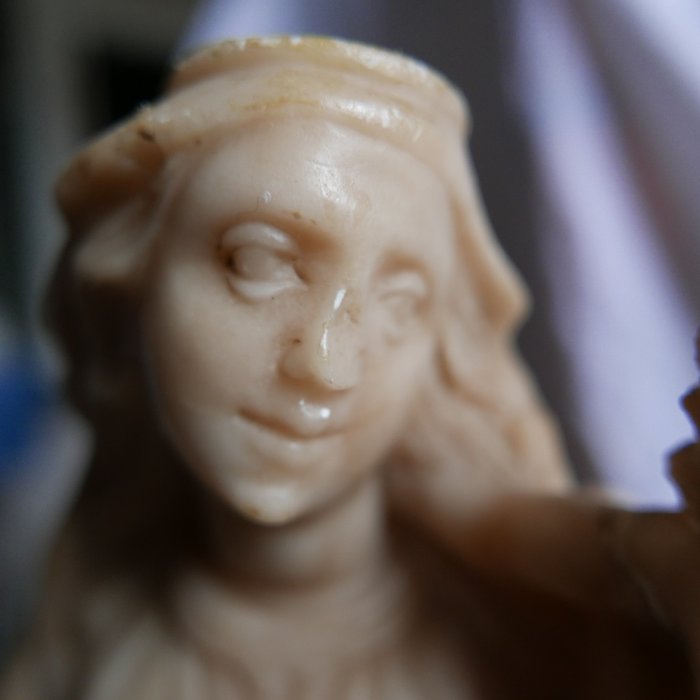 Maagd en kind in albast, Italië waarschijnlijk Trapani. Eind 17e begin 18e eeuw. Sculptuur van zeer goede kwaliteit met mooie draperingen. De maagd heeft een gebroken neus en een arm van het kind ontbreekt. Breek en lijm opnieuw op twee plaatsen.