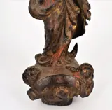 Beschrijving: Belangrijke polychrome houten sculptuur voorstellende de Onbevlekte met de opwaartse beweging van het gordijn.