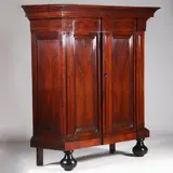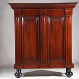 Drentse pastoorskast in palissander op de markante zwart gepolitoerde bolpoten, de drie stijlen met een verhoogd vlak. De stijlen springen naar voren, verkroppen zoals dat heet. Dit breekt het vlak van het front en de kroon.