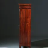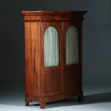 Hollands tweedeurskastje met deels beglaasde deuren, op kleine platte geprofileerde pootjes. Een vierkant bloemmahonie paneel in de onderzijde der deuren, daarboven twee toogvormige ruiten, daarachter een bespanning is stof, deze kan eenvoudig worden uitgenomen. De plank indeling kan daar dan op worden aangepast.