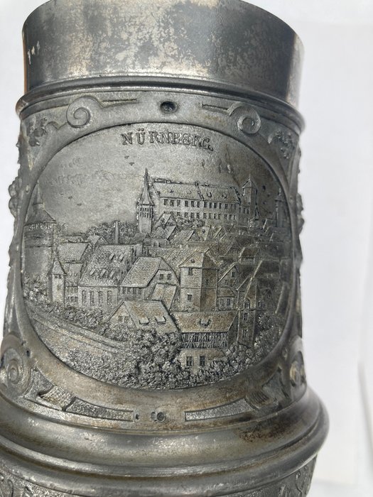 Het item is gegoten en gesmeed en rijkelijk gedecoreerd met florale motieven en twee afbeeldingen van de stad Nürnberg in Duitsland