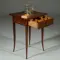 Dit bijna vierkante. iets doorleefde mahonie tafeltje heeft een fraai ingelegde lade, daarin een handige vakverdeling en staat op vier sabelpootjes. De pootjes met dunnen blonde biezen ingelegd.