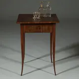 Dit bijna vierkante. iets doorleefde mahonie tafeltje heeft een fraai ingelegde lade, daarin een handige vakverdeling en staat op vier sabelpootjes. De pootjes met dunnen blonde biezen ingelegd.