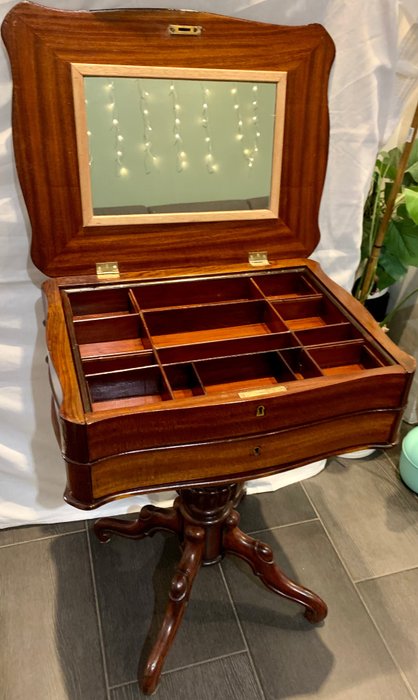 De tafel heeft 2 compartimenten waarvan 1 met spiegel en kleine vakjes. Daaronder is een tweede laten. Af te sluiten met een sleutel.