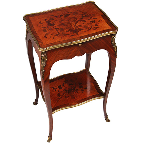 De beide tafelbladen zijn licht geschulpt en met een bronzen vergulde rand afgezet. De vlakken van de bladen in vier vlakken verdeeld met een weelderig bloemmotief ingelegd. De gebogen poten met verguld beslag op de “knieën en de tenen”.