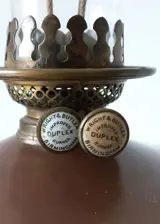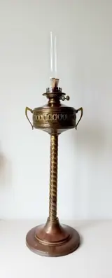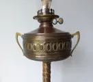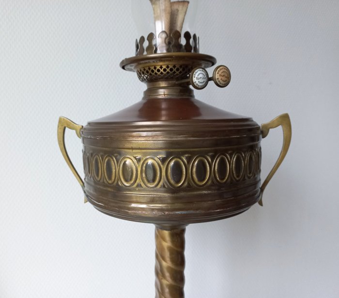 Zeer bijzondere grote staande koperen olie lamp met dubbele Wright&Butler Birmingham Brander en is in goede werkende staat uit de 19e eeuw.