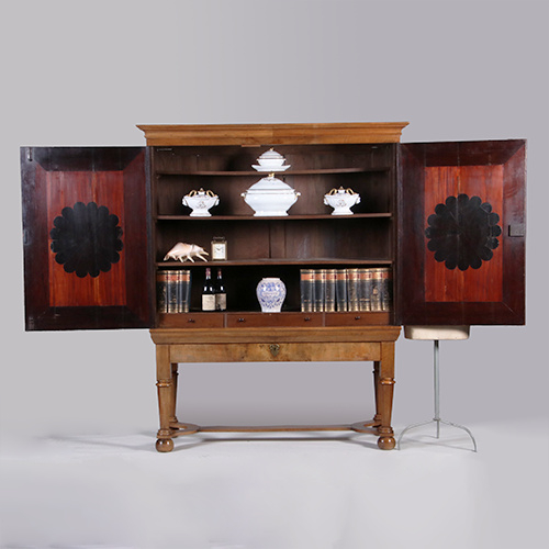 Blond Hollands kruisvoetkabinet op foedraalpoten 1690– 1710 de deuren en zijpanelen met prachtige geometrische bloemmotieven, de centrum bloem met 16 bloemblaadjes. Aan de binnenzijde van de deuren een zeer verrassend, diapositief variant van de buitenkant; een zwarte bloem met 16 blaadjes op een rode ondergrond met zwarte omlijsting. Onder de deuren een brede lade.