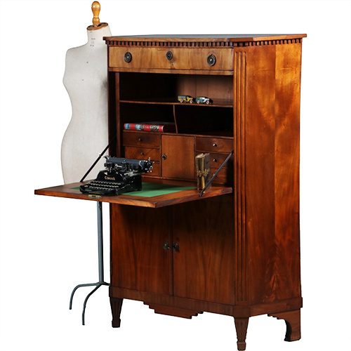 Hollandse secretaire abattant of klepsecretaire in de typische Hollandse soberheid, de tandlijst onder het blad en de cannelures zijn de enige uitbundigheden. Ook het interieur is kenmerkend voor de Hollandse eenvoud van die dagen. De indeling met in de onderkast twee deuren, dan de schrijfklep en daarboven nog een flinke lade.