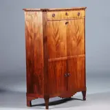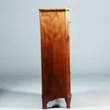 Vrijwel smetteloos, in prachtige staat, kleine gebruikssporen rond het meubelbeslag, Het groen ingelegde schrijfvlak is niet nieuw maar zeer patent. Dit kan tegen meerprijs eventueel vervangen worden door bijvoorbeeld goud gestempeld leer. Voor aflevering zal onze meubelmaker de kast prachtig poetsen en de kleine gebruikssporen zullen dan vrijwel onzichtbaar worden. Prijs inclusief de genoemde goede zorg transport en plaatsing.