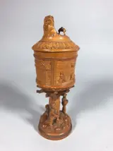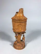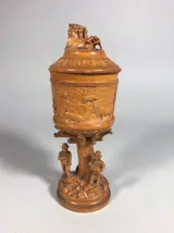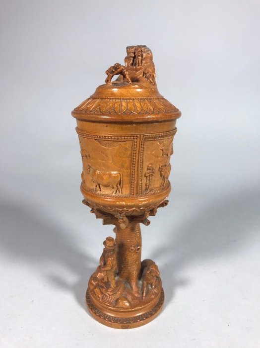 Zeer fijn gestoken beker of bokaal van mogelijk olijfhout. Met voorstelling van herders, vee en figuren. Herkomst waarschijnlijk Corsica.