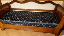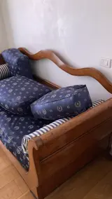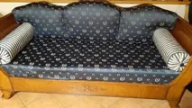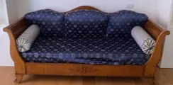 Bekleding van gewatteerde kussens en matras met Jacquard damaststof met dubbele kroon, afneembaar; logisch gezien zijn ze niet origineel gezien de leeftijd van het meubilair.