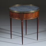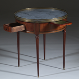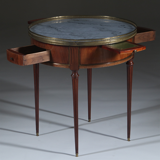 Luxe bouillotte tafel met een grijs geaderd marmeren blad daarlangs een opstaande bronzen rand In de zogenaamde ceintuur, de rand onder het blad bronzen vergulde profiellijstjes, twee kleine laden en twee tirettes. Die laatste werden gebruikt om kandelaartjes op te plaatsen. Het geheel op vier ronde gedraaide tapse poten met cannelures.