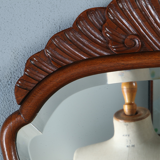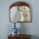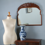 Originele antieke spiegel met kleine gebruikssporen in het hout en in het glas kleine spikkeltjes met name rechts en midden boven. Het hout in een mooie ouder kleur en glans.