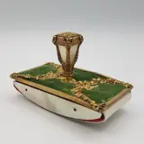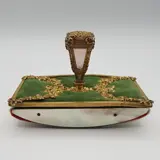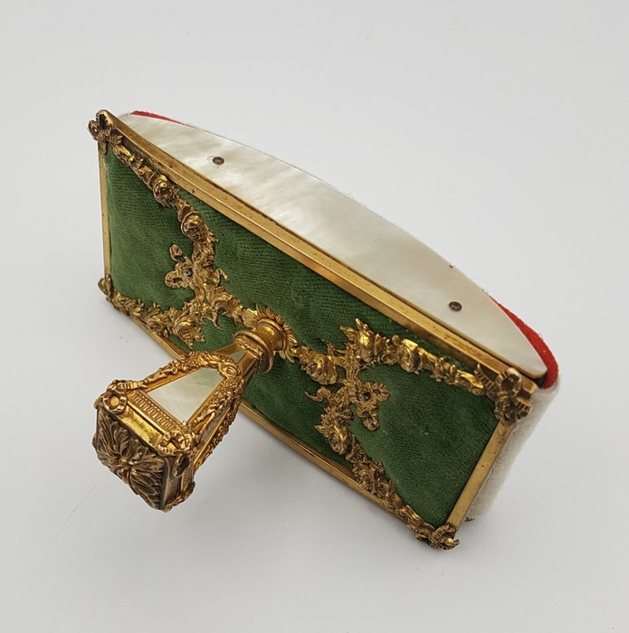 In het bovenste gedeelte, op een groene fluwelen achtergrond, heeft het blok een fijne beitel van het vergulde metaal dat rijk is aan friezen en de centrale knop is vakkundig versierd met parelmoer aan alle vier de zijden. Elegante parelmoer inzetstukken zijn ook terug te vinden op het schommelkussen.