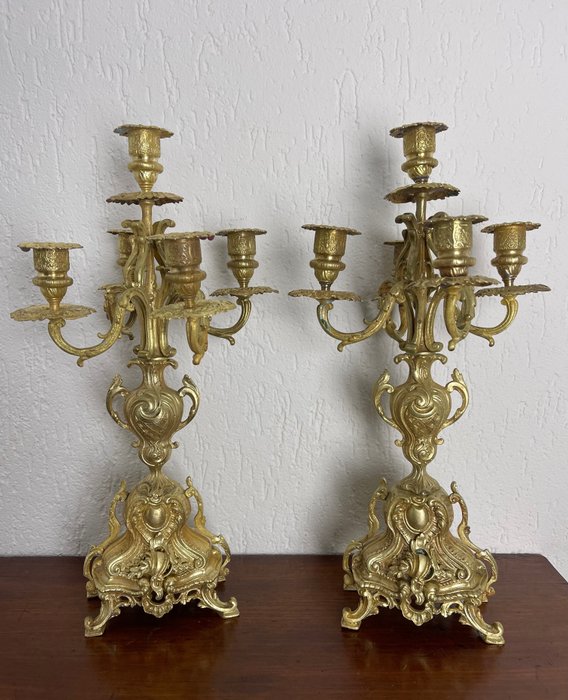 Koppel fraaie, bewerkte bronzen kandelaars met ruimte voor vijf kaarsen op mooi bewerkte voet. Met mooie warme patina en sierlijke vormgeving.